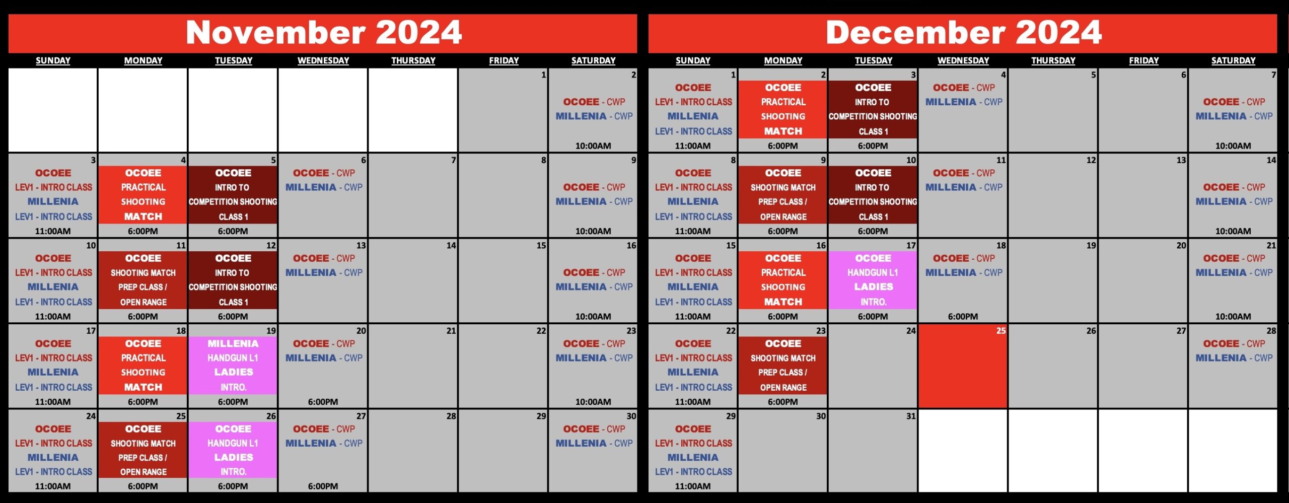 MASTER CLASS SCHEDULE FOR THE NEXT TWO MONTHS ABOVE. TO BOOK A CLASS, SCROLL DOWN TO THE SPECIFIC CLASS DESCRIPTION BELOW. The Orlando Gun Club offers a variety of classes and events for both individuals and groups. Classes are structured to help increase firearms proficiency at various levels.